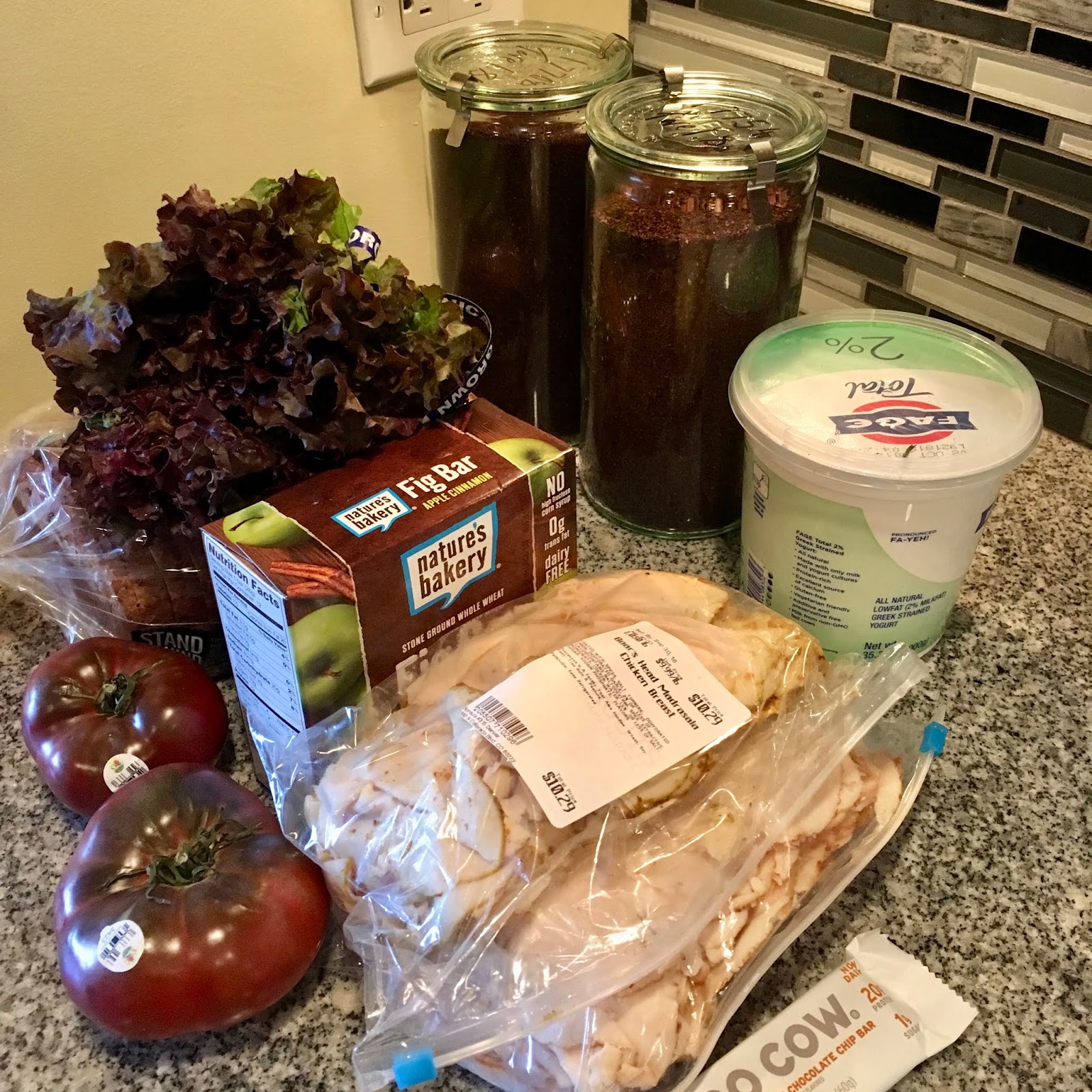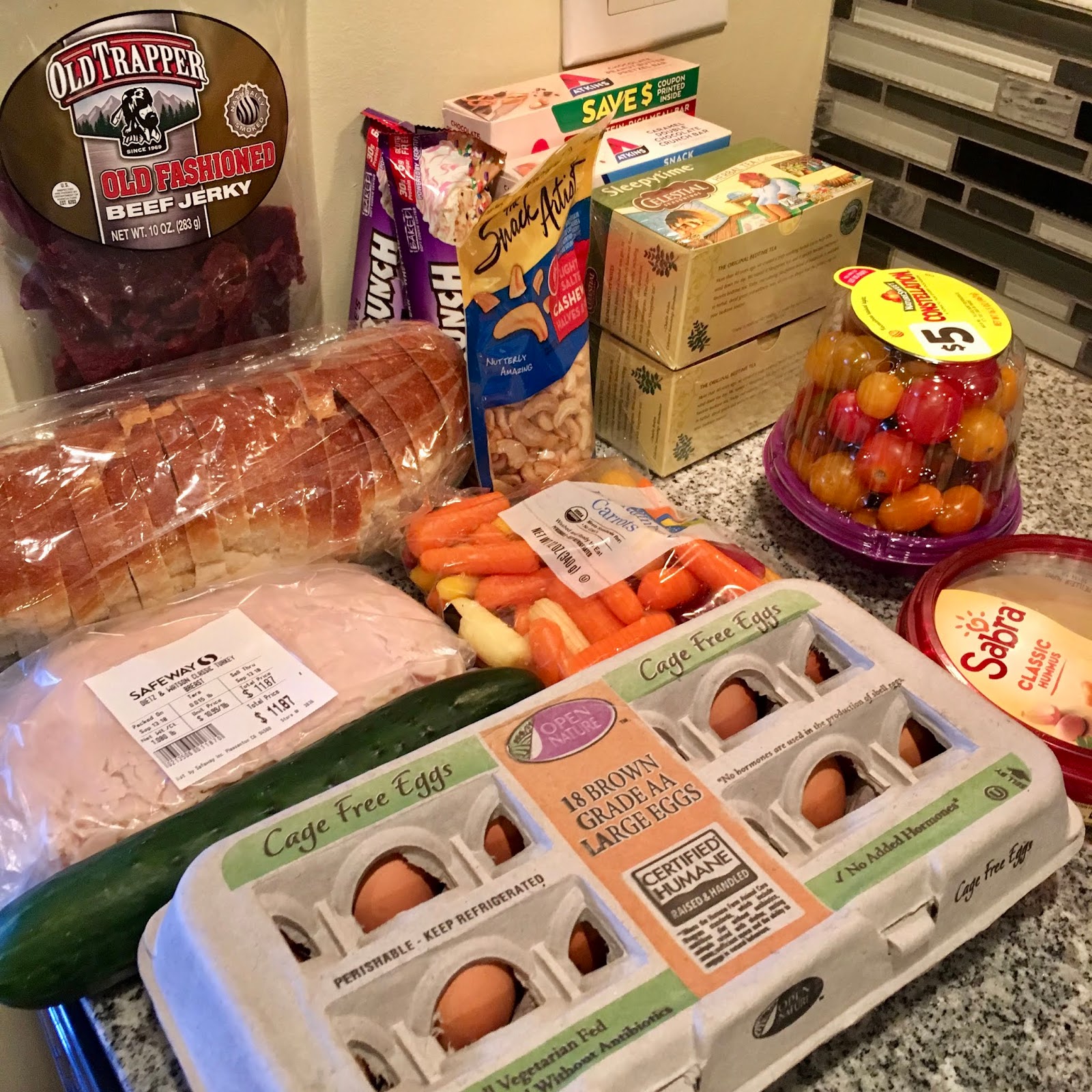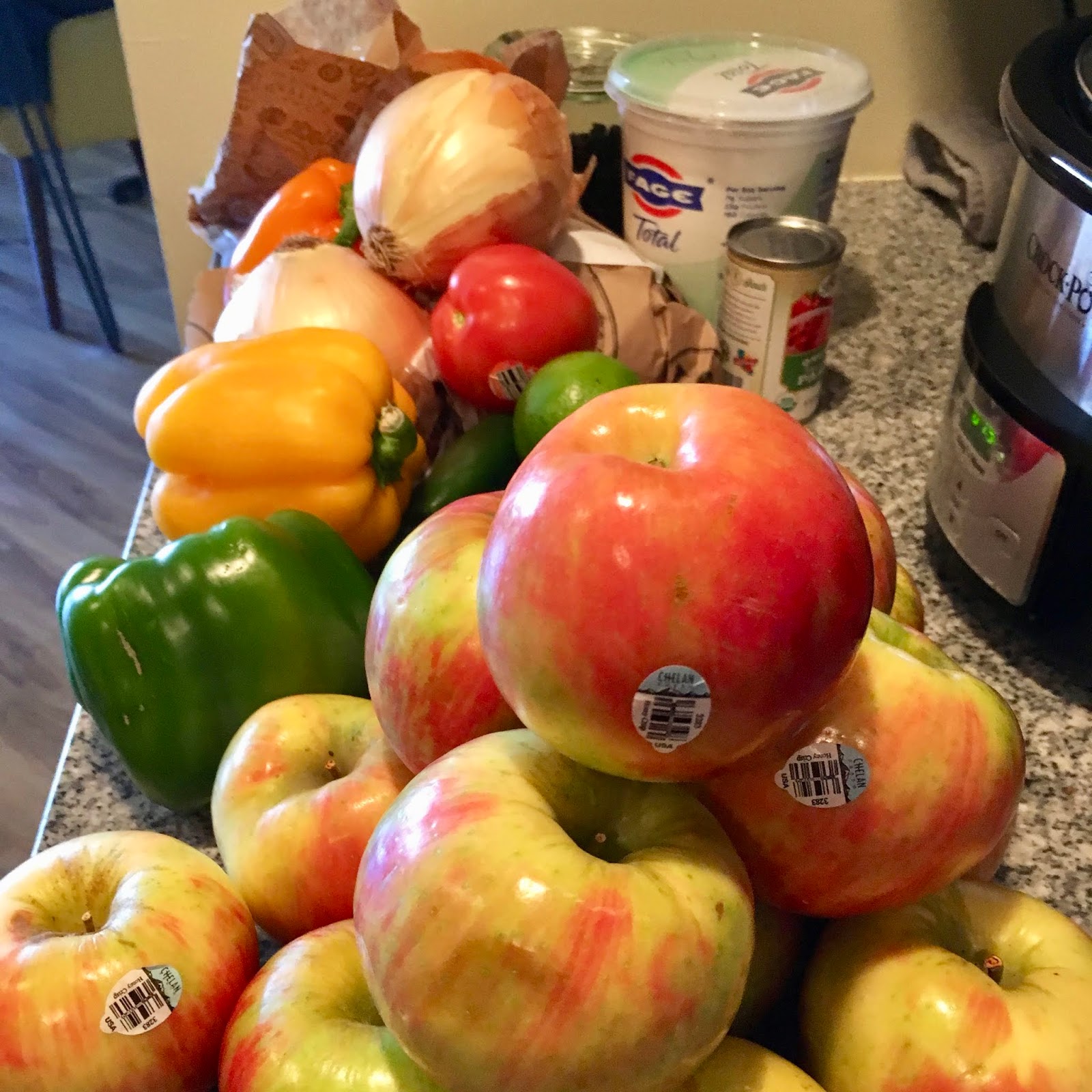 Not pictured are three limes, an orange, chips, pita bread, and non-diary butter cups that we got on the way to a game night at a friend’s house. Not to worry though, they’ll be included in the final tallying.