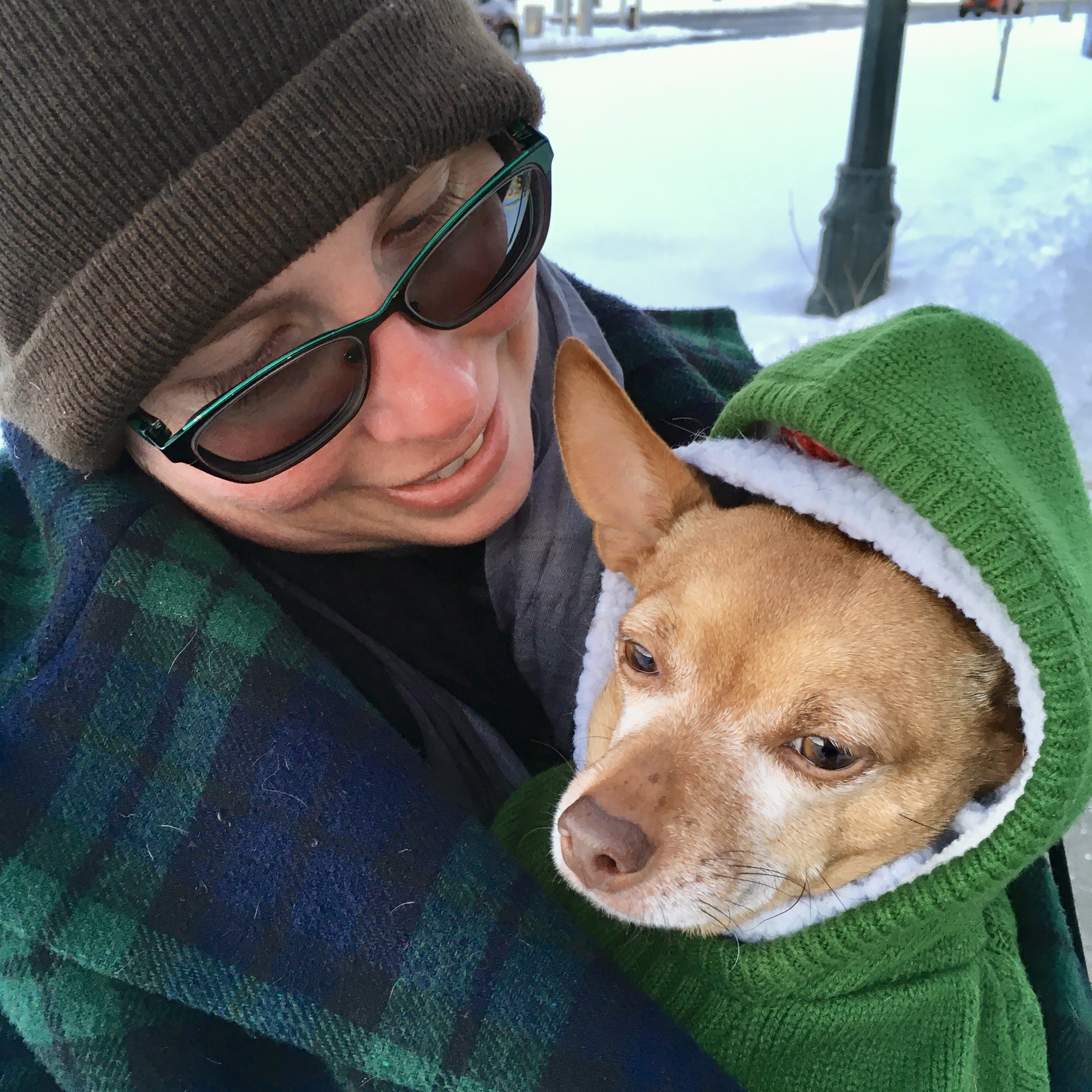 Sisko is not a fan of the cold. We got about 8″ of snow last Monday, but it was still reasonable (albeit cold) enough for a walk. Sisko decided he wasn’t going to walk any further, so we bundled him up into my jacket and carried on. He ended up wearing two sweaters and booties while be snug and HOT inside my coat.