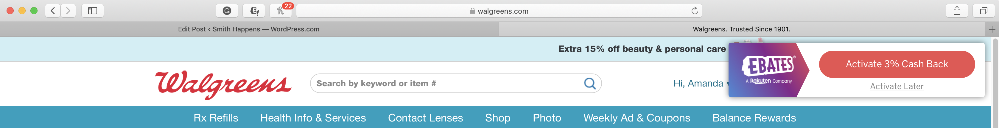 Once you sign up for Ebates, using it is super easy. The first thing you need to do is install the extension/button to your browser. Then you shop as normal. What you’ll see is a pop-up when the store you’re at offers an ebate (like in the picture below). All you need to do is click on the activate button before you check out.