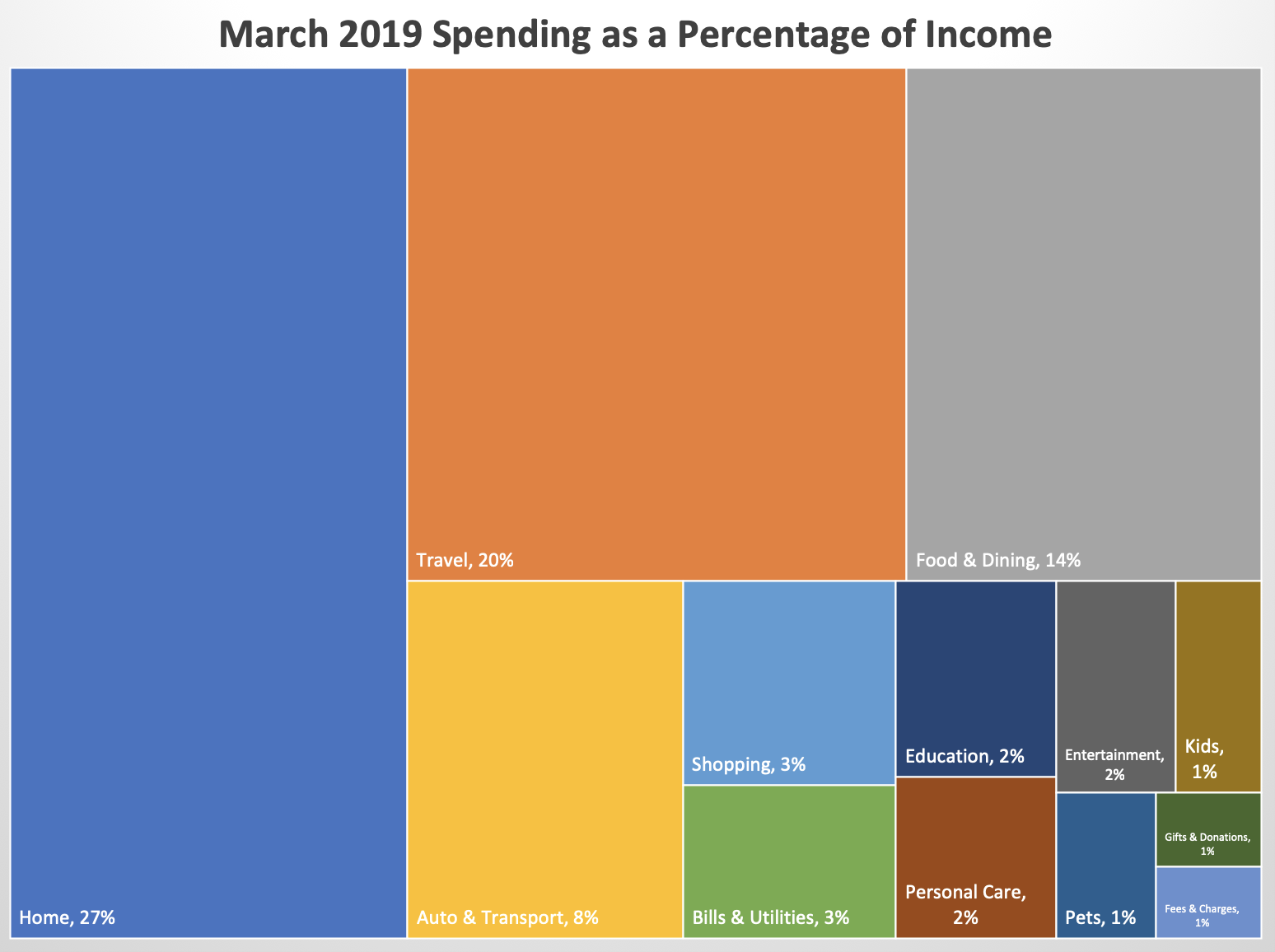 March was a pretty typical month for us. Home expenses made up 33 percent of our spending and 27 percent of our income for the month. This category includes rent and home supplies.