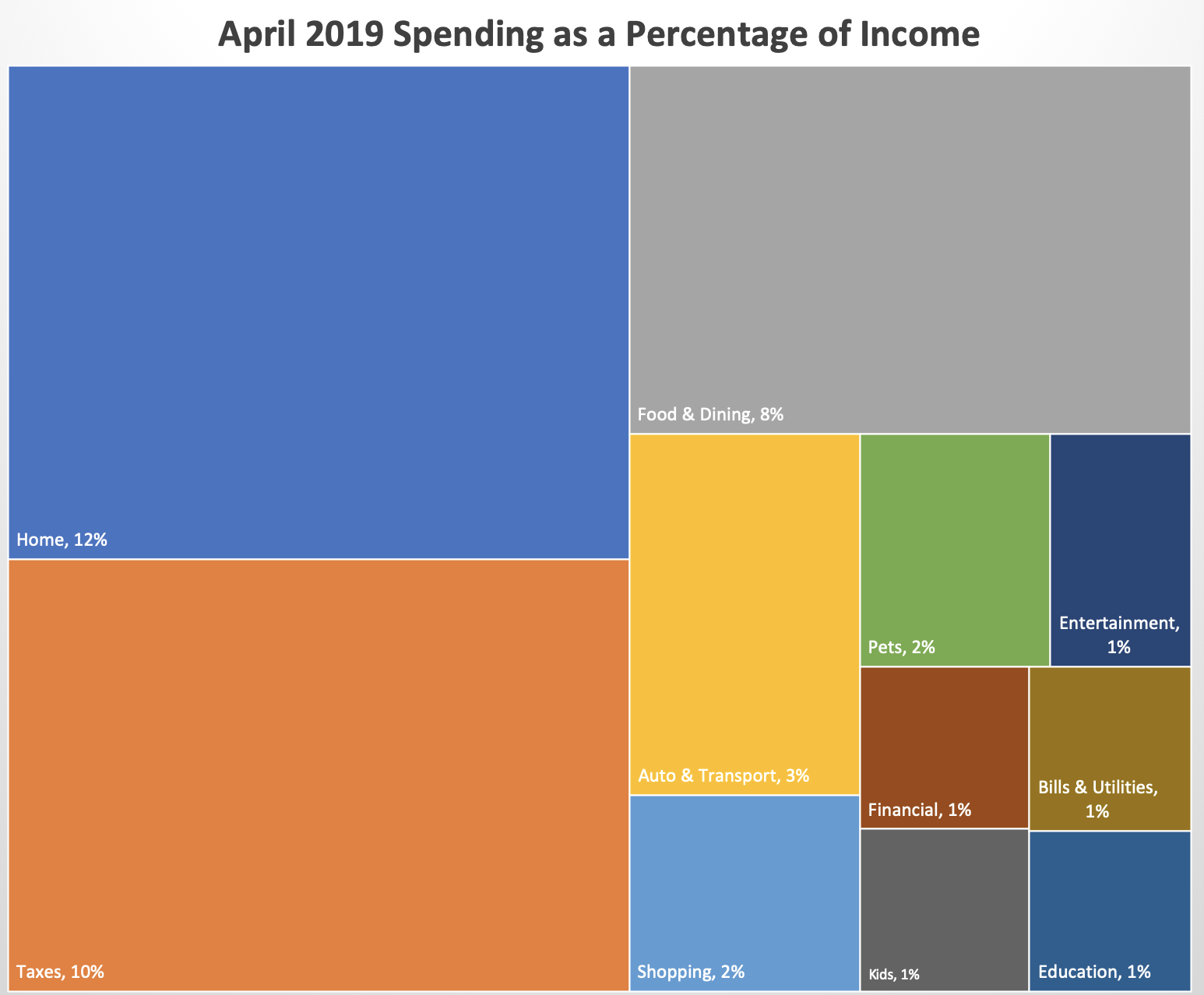 April was a typical housing expense month for us. Housing was 28 percent of our spending and 12 of our monthly income. We had our typical housing expenses this month of rent and home supplies (like new dish scrubbers). We also paid our annual renter’s insurance premium. Now, some of this is likely to be refunded after we move to the new house and are no longer renters.