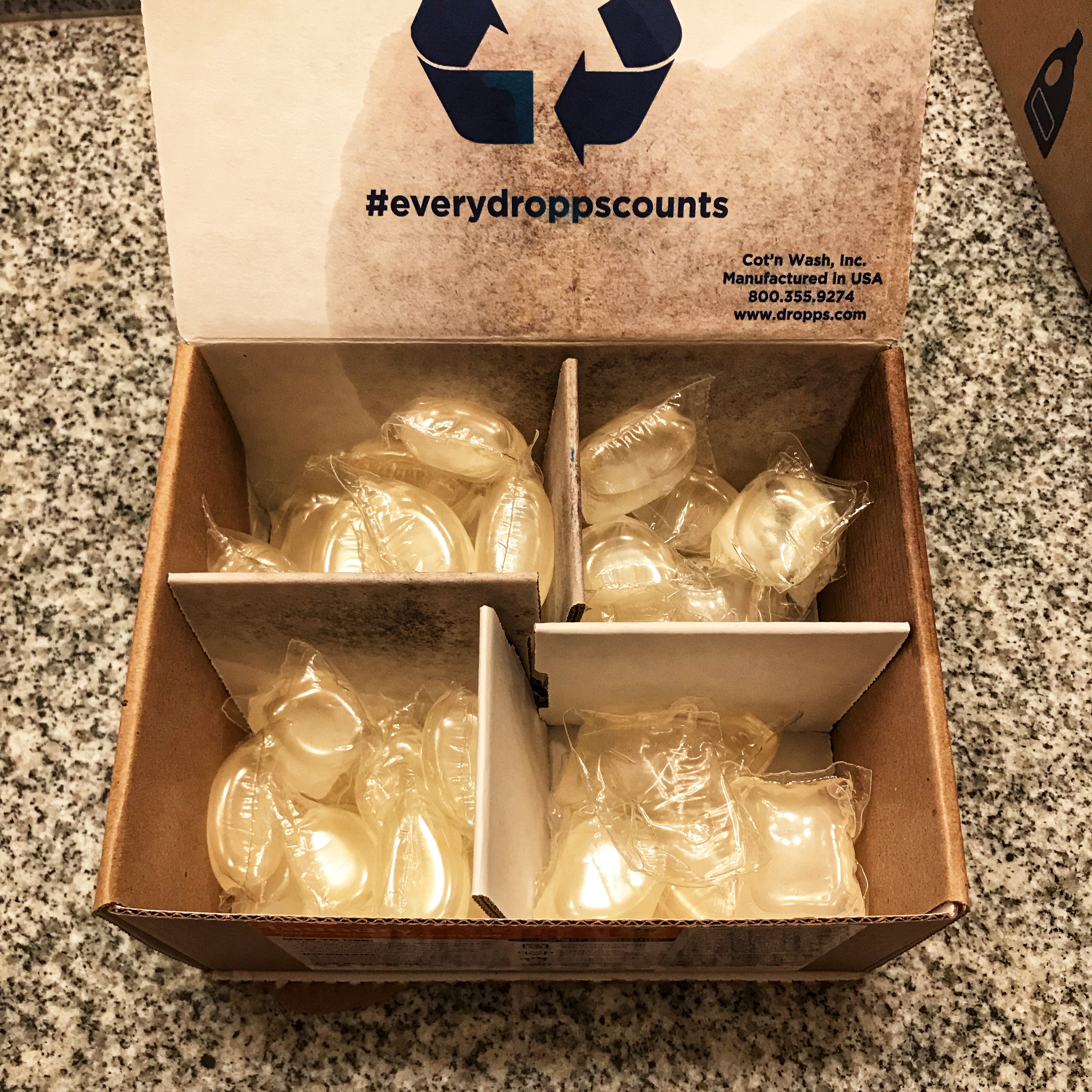 In terms of plastic reduction, dropps is the way to go. The pods arrive in a compostable or recyclable cardboard box. There aren’t any plastic bags holding things together or excessive tape on the box. At most, you just need to remove the shipping label. Since we do apartment composting, I opt to recycle the box. Our worms get more than enough fiber in their diet from egg cartons.
