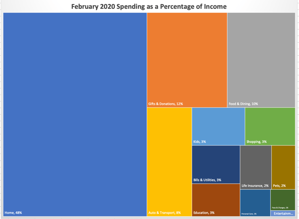 I used Mint to generate the spending report and figure out our current net worth. It’s not perfect, but as Mr. Smith likes to say, “Don’t let the perfect be the enemy of the good.” Without further ado, here’s where we ended up at the end of February 2020.